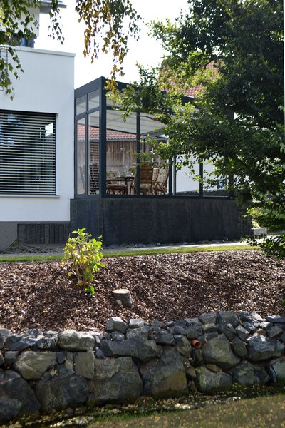 Diese Terrassenüberdachung von WIKOMA bietet die Möglichkeit, im Freien zu sitzen, selbst bei unbeständigem Wetter. Einseitig angebrachte Seitenteile aus Aluminium schützen vor Wind und Regen, ohne dabei den offenen Charakter der Terrasse zu beeinträchtigen. Das Aluminium in RAL 7016/matt passt sich dabei perfekt den vorhandenen Fenstern an.