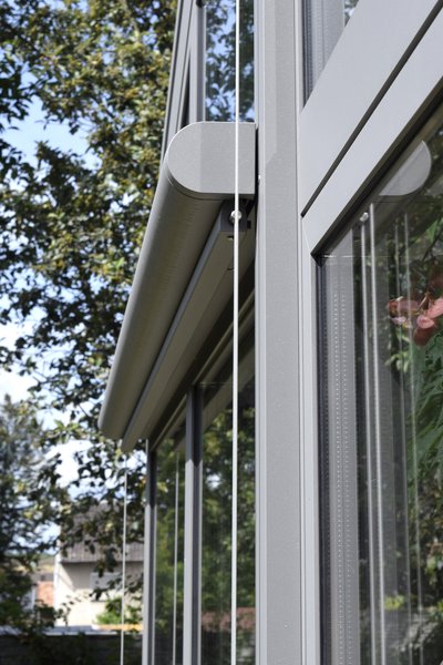 Bei dieser Terrassenüberdachung schützen einseitig angebrachte Seitenteile aus Aluminium vor Wind und Regen. Die Rahmenteile wurden farblichan die vorhandenen Fenster angepasst. Eine Unterglas-Markise schützt auch ...