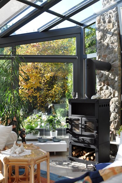 Gemütliche Stunden vor dem Ofen im ganzjährigen Aluminium-Wintergarten