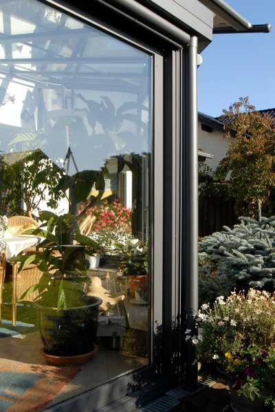 Die Pulverbeschichtung in der Farbe DB 703 mit einer Feinstruktur verleiht dem Aluminium-Wintergarten ein edles und mattes Finish. Durch die ästhetische Gestaltung fügt sich der Wintergarten harmonisch in die Umgebung ein.