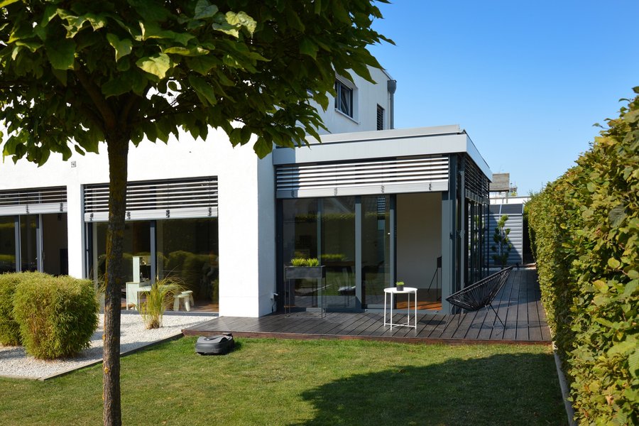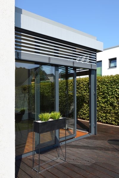 Nahtlos fügt sich dieser WIKOMA-Wintergarten aus Aluminium in die Gestaltung der Außenfassade ein. Besonders die visuell dominanten Außenjalousien und der exakt gleiche Farbton der Pulverbeschichtung sowohl am Gebäude als auch am Wintergarten tragen zum harmonischen Gesamtergebnis bei.