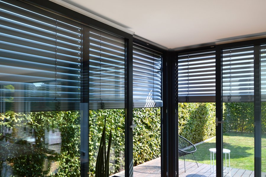 - Aluminiumkonstruktion mit visuell dominanten Außenjalousien