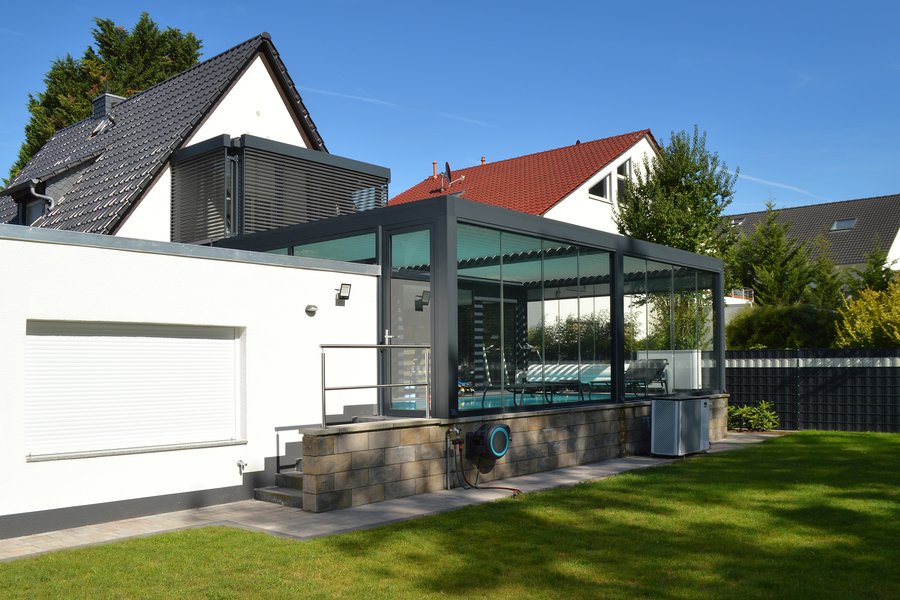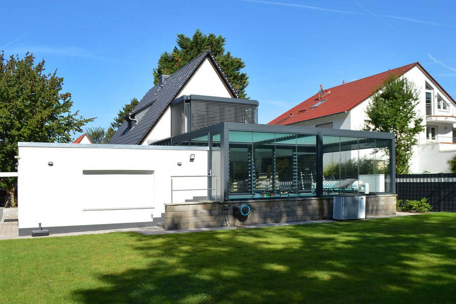Großer Aluminium-Wintergarten im Kubusstil als Erweiterung des oben gelegenen Schlafzimmers und als Erweiterung des Wohnraums. Ergänzt durch eine Poolüberdachung mit Lamellendach.