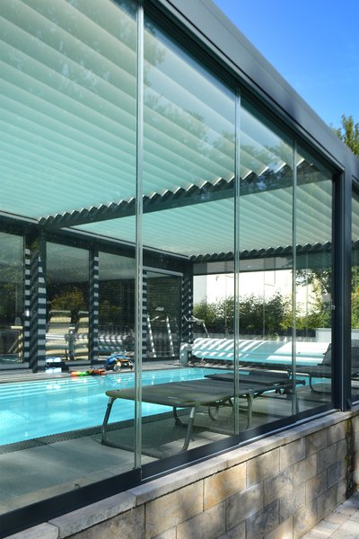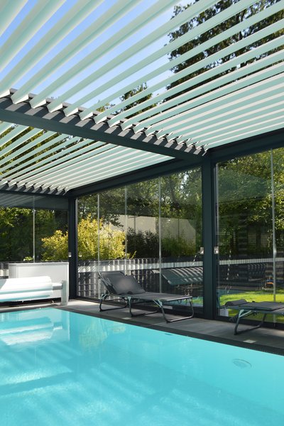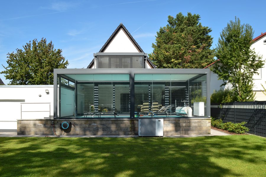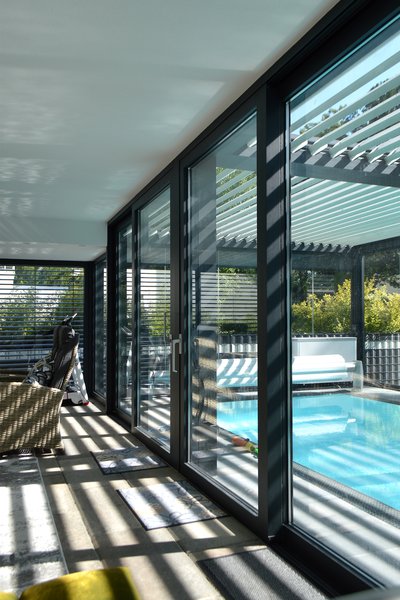 Vorgelagert wurde zudem eine große Poolüberdachung mit Lamellendach und Elementen zum schließen. Das Lamellendach schützt nicht nur vor starker Sonneneinstrahlung sondern sorgt auch für reizvole Licht- und Schattenspiele.