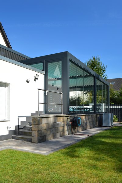 Dieser Aluminium-Wintergarten von WIKOMA mit Pultdach steht auf einem Balkon und gibt den Blick auf das Umland frei. Der Wintergarten erweitert den Wohnraum im ersten ...