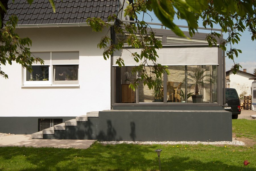 Die Wintergartenmarkise und die Senkrechtbeschattung an der Außenseite ermöglichen eine präzise Dosierung des Lichts. Dies erlaubt den Bewohnern, die Helligkeit im Wintergarten nach ihren individuellen Vorlieben anzupassen.
